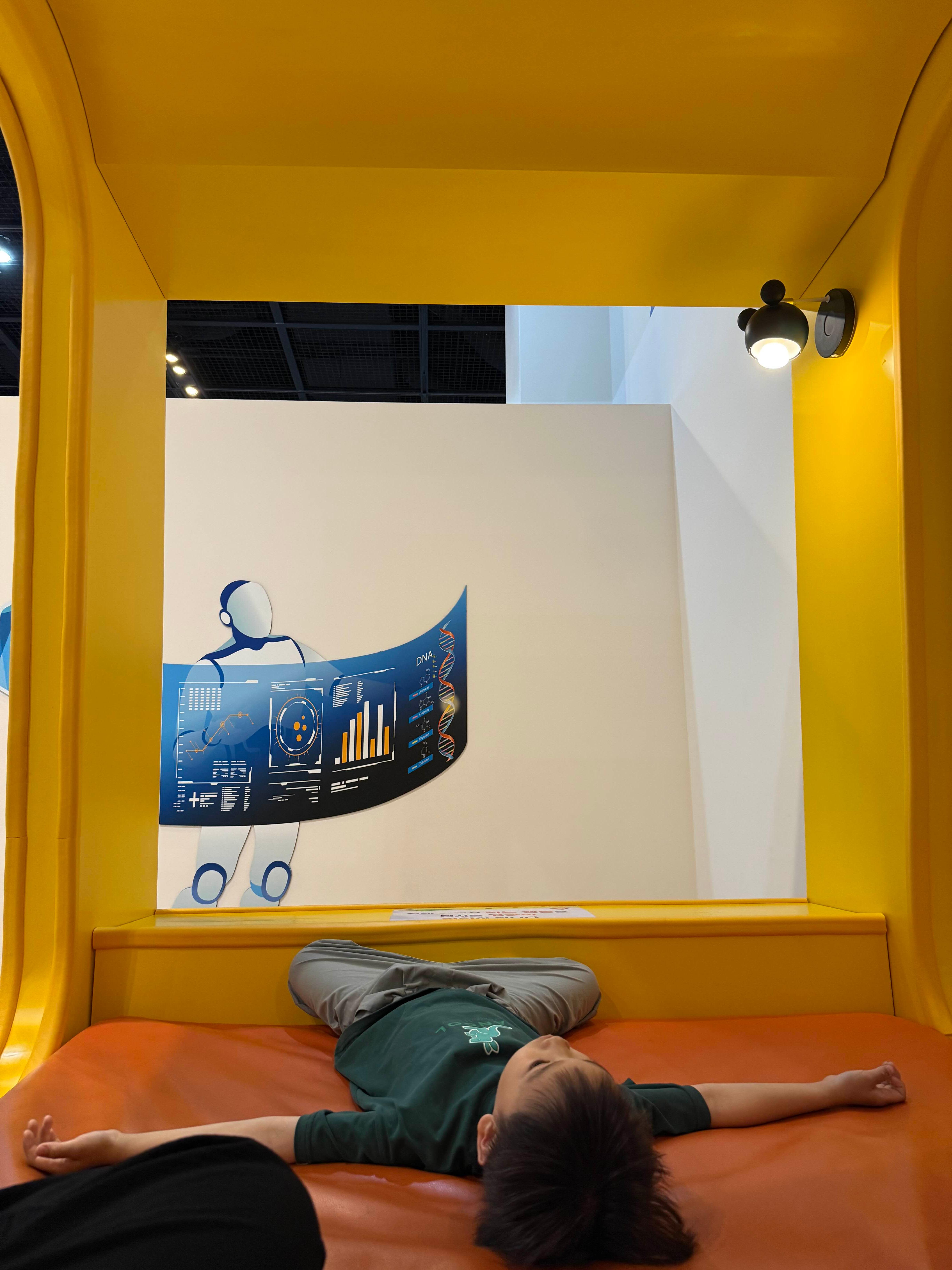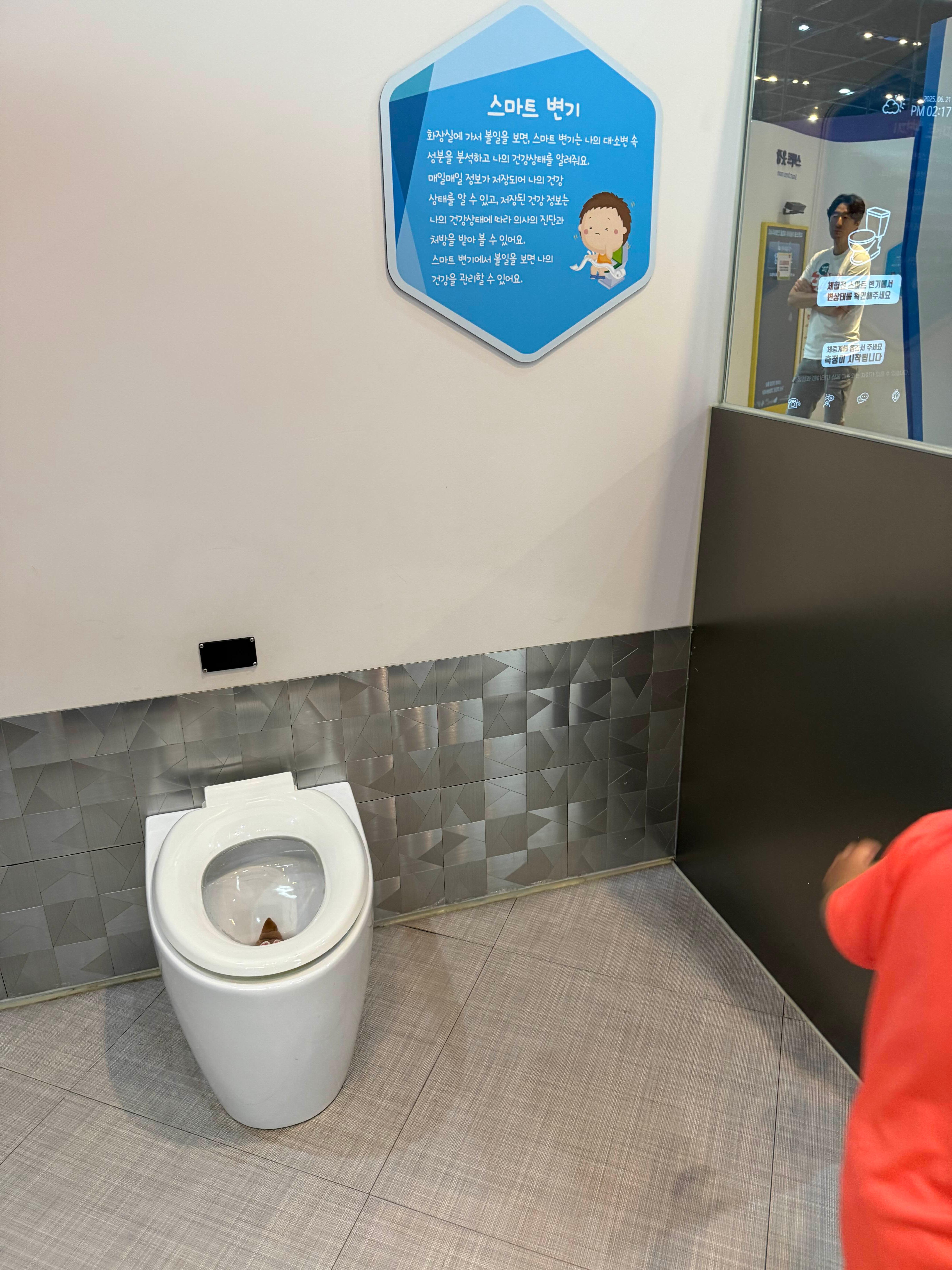 스마트 변기가 있는데 이 안에 똥인형이 있어서 쿤이가 재미있어하면서 직접 앉아도 봤어요스마트 침대가 있어서 누울 수도 있는데 누워보니 천장에서 화면이 있더라구요오늘 날씨도 알려주고 내체온도 알려주고 신기한데 이전엔 먼세상 이야기 같았는데 이젠 이런 세상이 금방 올거 같았어요