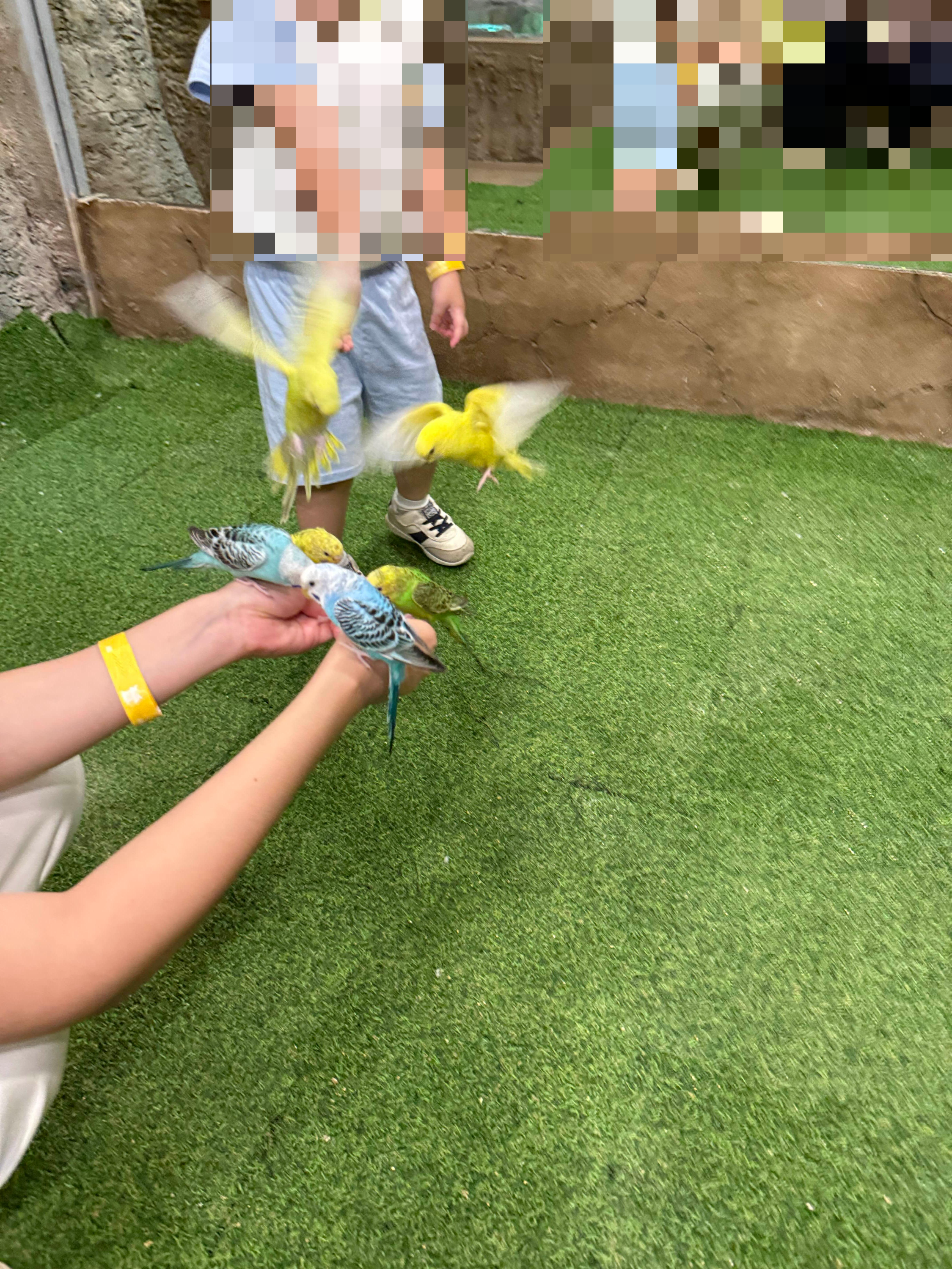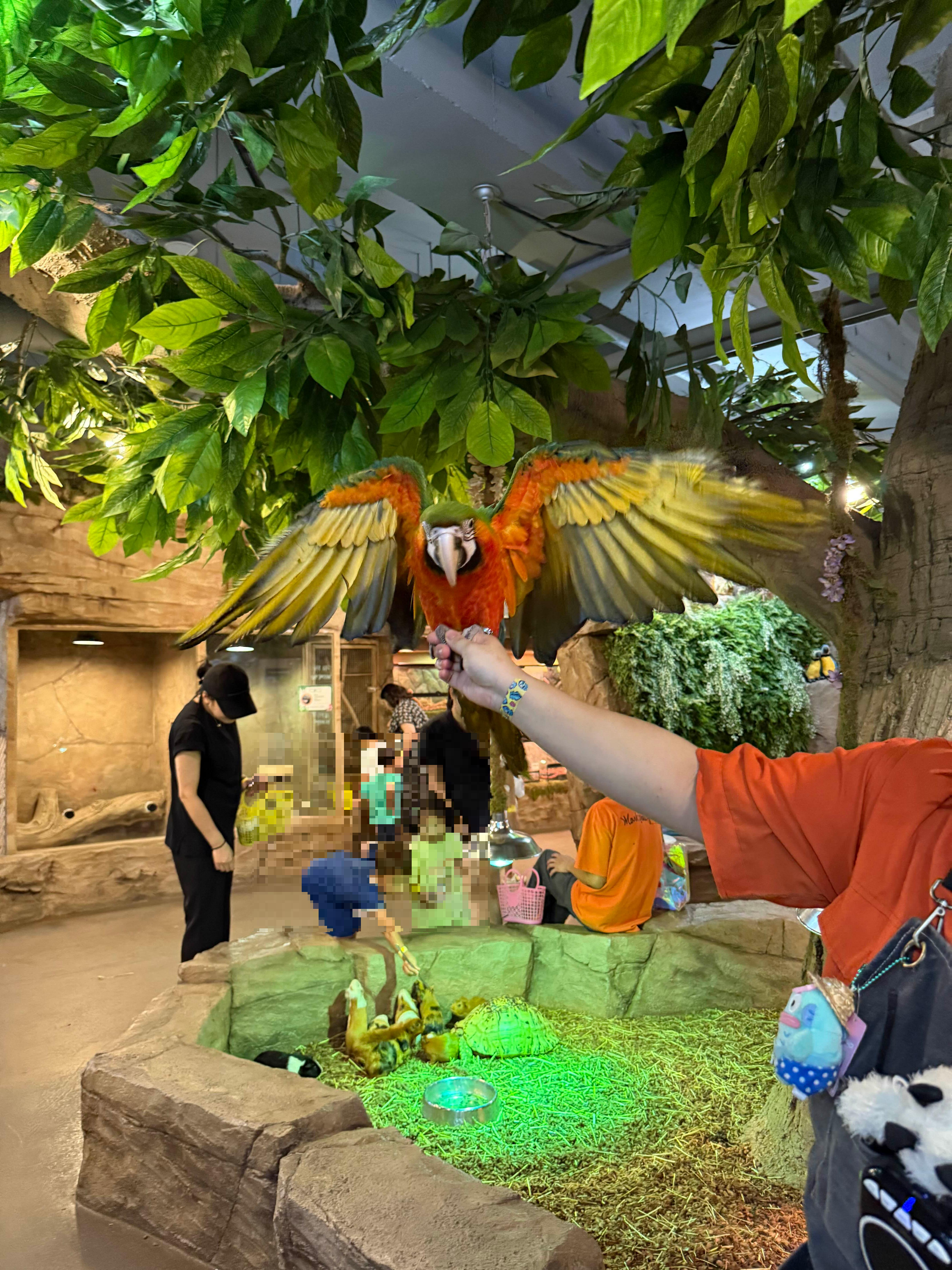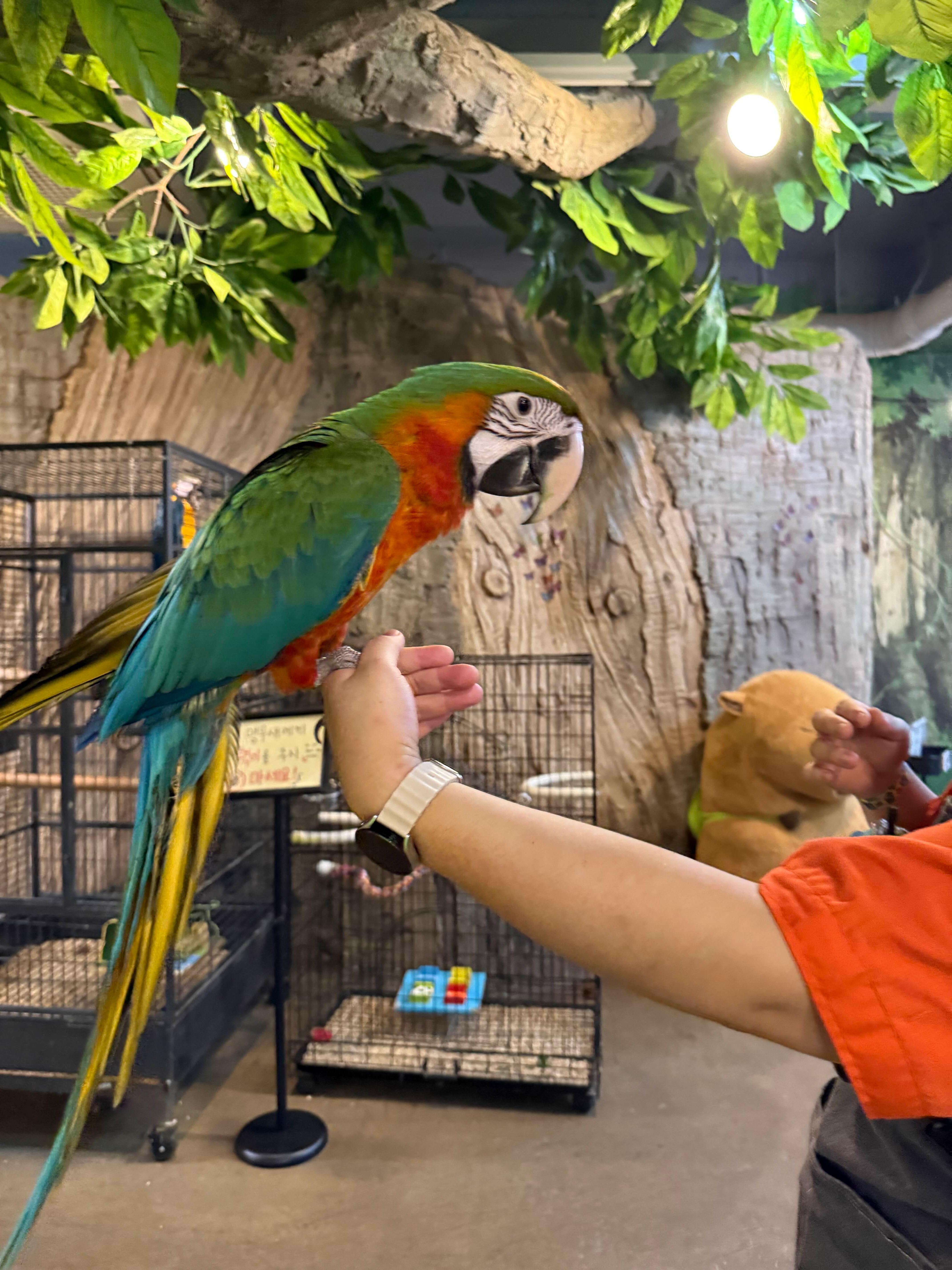 저희는 패럿과 앵무새 체험을 했어요. 눈앞에서 퍼덕이는 날개와 선명한 색깔이 인상적이었고