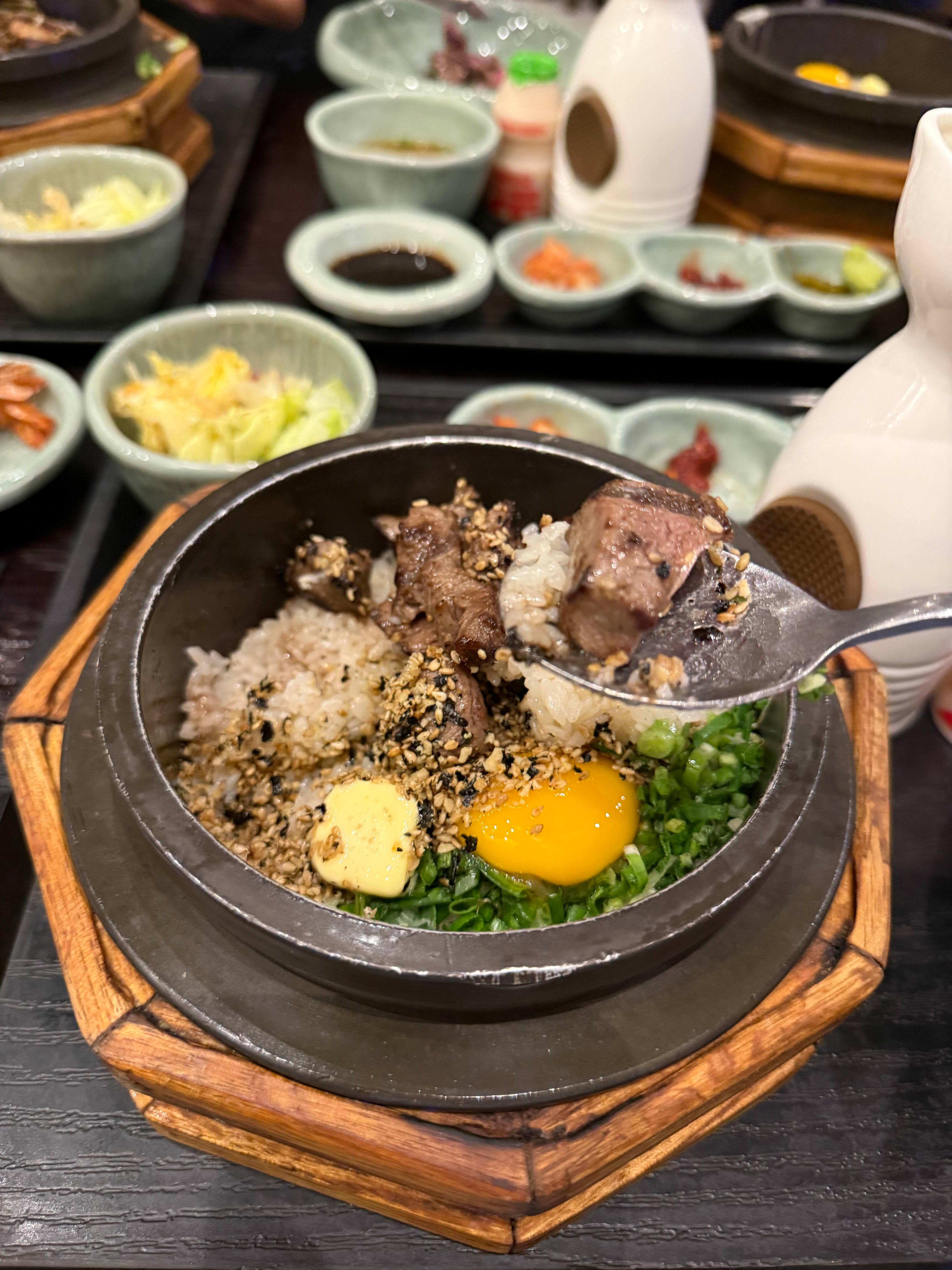 이날도 쿤이와 저는 변함없이 스테이크 솥밥을 주문했어요