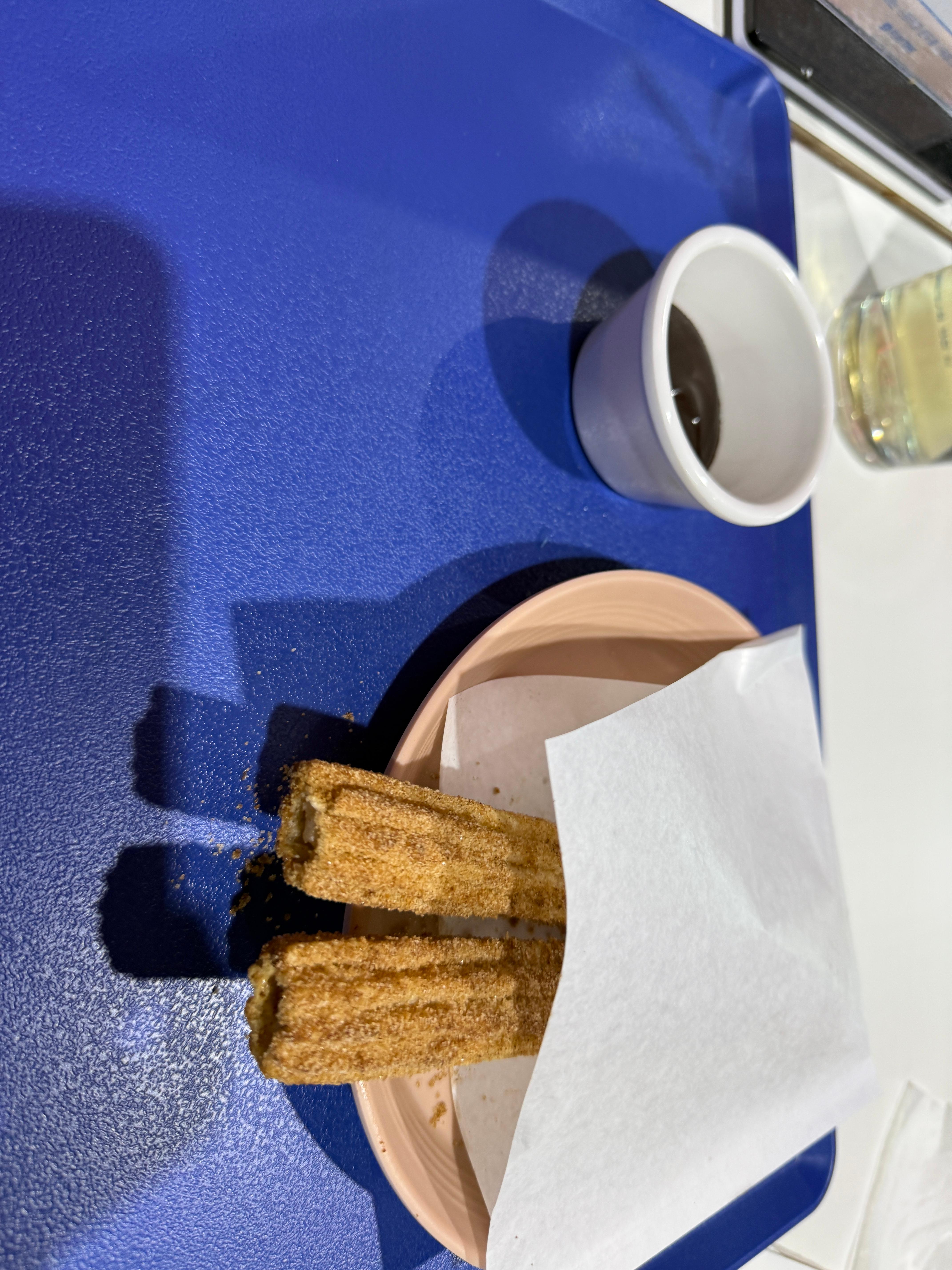 중간에 잠깐 쉬면서 테이블에 앉아 카라멜 팝콘과 초코 츄러스를 먹었어요.